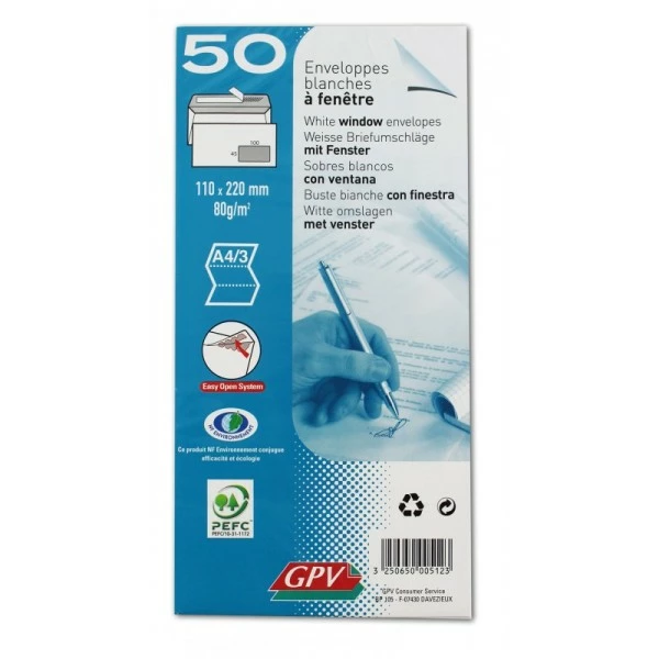 “50 enveloppes blanches à fenêtre – 110×220 mm – 80g – GPV