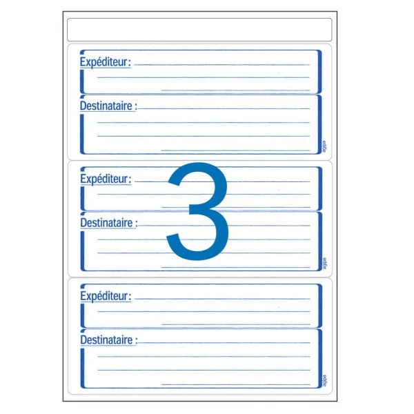 Etiquettes expéditeur/destinataire blanches impression bleue multi usage 64×133 mm. Pochette 16 feuilles A5 multi-usage soit 48 étiquettes. Adhésif permanent.