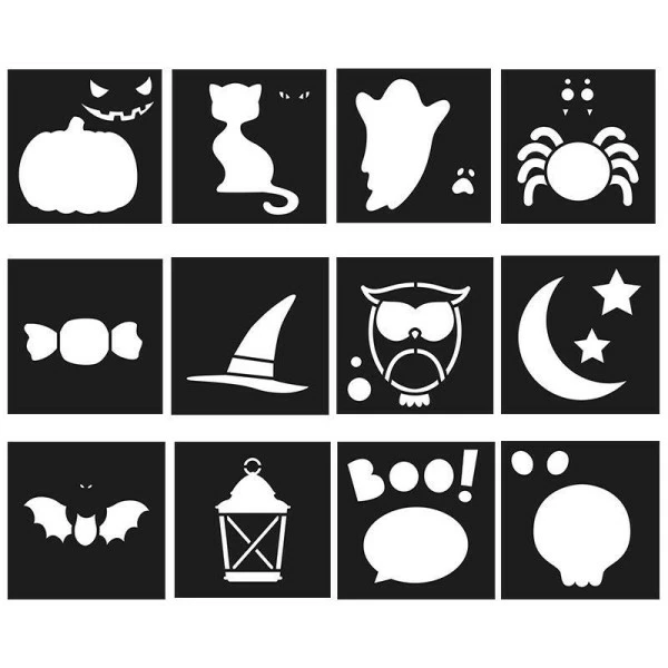 Cet ensemble de 12 pochoirs vous permettra de personnaliser votre décoration pour Halloween.