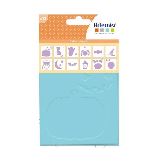 Cet ensemble de 12 pochoirs vous permettra de personnaliser votre décoration pour Halloweencitrouille, chat, fantome, araignée, bonbon, chapeau de sorcière, hibou, lune, chauve-souris, lanterne, boo et squelette. Chaque pochoir mesure 9 cm x 9 cm. Le pochoir permet de reproduire un motif sur tout support, décoration ou scrapbooking, au moyen de bombe de peinture, craie ou stylo, afin de créer de jolis motifs détaillés sur vos projets de décoration! Mode d’emploiPositionner le pochoir à l’endroit souhaité sur le support. Appliquer la peinture ou l’encre à l’aide d’un pinceau. Ôter le pochoir et laisser sécher. Après chaque utilisation, il est nécessaire de nettoyer vos pochoirs sous l’eau avec un peu de savon. Les pochoirs sont en plastique.