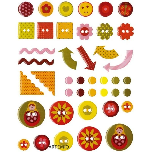 Astuce décoCertains stickers scrapbooking de cet assortiment Espagne sont en forme de bouton. Amusez-vous à les coller puis à les coudre sur votre page de scrapbooking. Le résultat est vraiment très sympa, vous verrez !