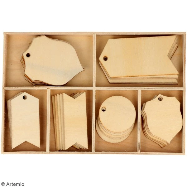 Cet assortiment de 36 étiquettes en bois vous offrira de multiples possibilités créatives et décoratives, comme par exemple vous lancer dans des paquets cadeaux décoratifs pour Noël. Ces étiquettes en bois de 2 mm d’épaisseur mesurent entre 3,7 cm et 8 cm de longueur et les différentes formes (rond, blason, rectangulaire) vous permettront de décorer au mieux vos emballages cadeaux !