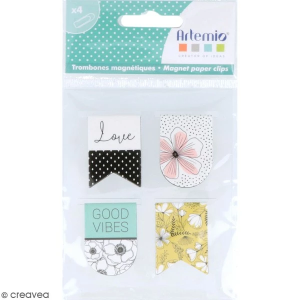 Ces 4 trombones magnétiques décoratifs aux couleurs et motifs de la collection Good Vibes Artemio, sont très pratiques et jolis. En effet, ces trombones fantaisie pourront être utilisés pour maintenir des étiquettes, du papier, des photos avec force et efficacité!