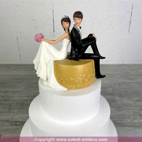Description de Couple de mariés en résine assis sur un pouf, hauteur 16 cm, figurines pièce montée, gâteau de maria