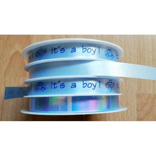 Description de Rouleau de 4 Rubans cadeaux Naissance garçon, 24 m x 1 cm, bolduc pour baby shower bleu it’s a boy