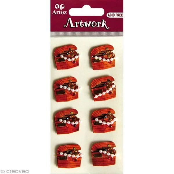 Planche 7 x 12 cm comprenant 8 stickers 3D Coffre à trésor de la collection Artwork par la marque Artoz. Ces jolis autocollants en volume seront de parfaits embellissements pour vos cartes, faire-parts, pages de scrapbooking et photos. Vous pourrez également faire le choix d’utiliser les 8 stickers 3D Coffre à trésor comme autocollants décoratifs en les collant sur vos objets fétichesjournal intime, carnet de notes…