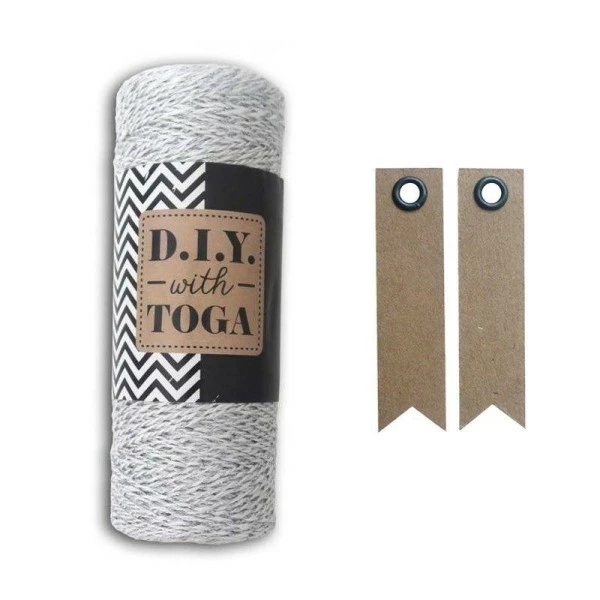 Apportez une touche chic et brillante à vos paquets cadeaux, à vos petits objets de décoration et à vos cartes de vœux avec cette bobine de fil tressé argent et blanc de 100 mètres. + 20 étiquettes kraft à œillet