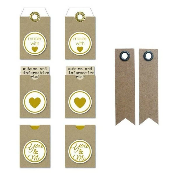 Comment indiquer au destinataire du cadeau que vous en êtes l’auteur ?Avec ces étiquettes kraft à cadeau, laissez-lui votre nom et un message !2 étiquettes Made with love, 2 étiquettes cœur et 2 étiquettes You & me, soit 6 étiquettes kraft perforées.Dimensions3,2 x 5,3 cm 20 étiquettes kraft en forme de fanion, dimension 5 x 1,2 cm.A utiliser pour le scrapbooking, la décoration d’intérieur, pour compléter le service de table d’un mariage.Ces étiquettes comprennent un trou avec un œillet marron foncé pour y faire passer une ficelle.