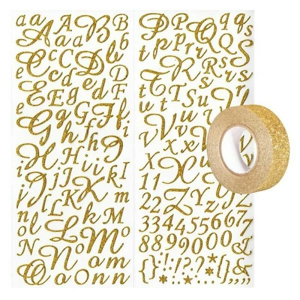 Alphabet autocollant 177 lettres, chiffres et signes dorés à paillettes + masking tape à paillettes 15 mm x 5 m