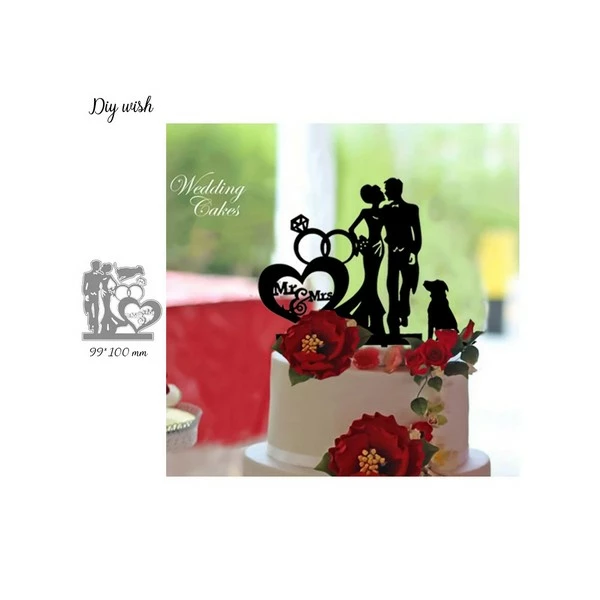 Matrice de découpe sur le thème du mariage avec ce die représentant les mariés, leurs alliances, un c½ur et leur chien. Réalisez un album de scrapbooking sur le thème du mariage. 2 pièces Dimensions9,7cm x 9,8cm