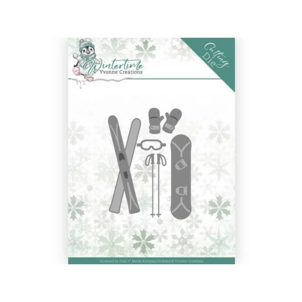 Matrices de découpe scrapbooking sur le thème des vacances d’hiver, avec cette paire de skis, les bâtons, le snowboard, le masque de ski et les gants Dimensions du snowboard6,5cm x 1,5cm Dimensions de la paire de skis7,5cm x 2,5cm