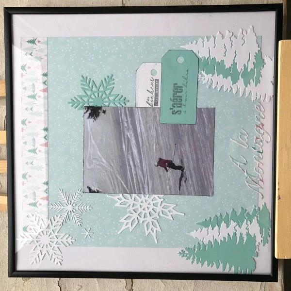 Kit comprenant le matériel nécessaire (papiers, découpes, papiers tamponnés) pour réaliser une page sur le thème de la montagne l’hiver. Facile, un tutoriel vous guidera.