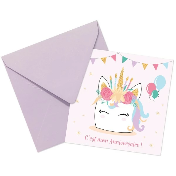 Description de Set cartons d’invitation – Licorne – 8 pièces