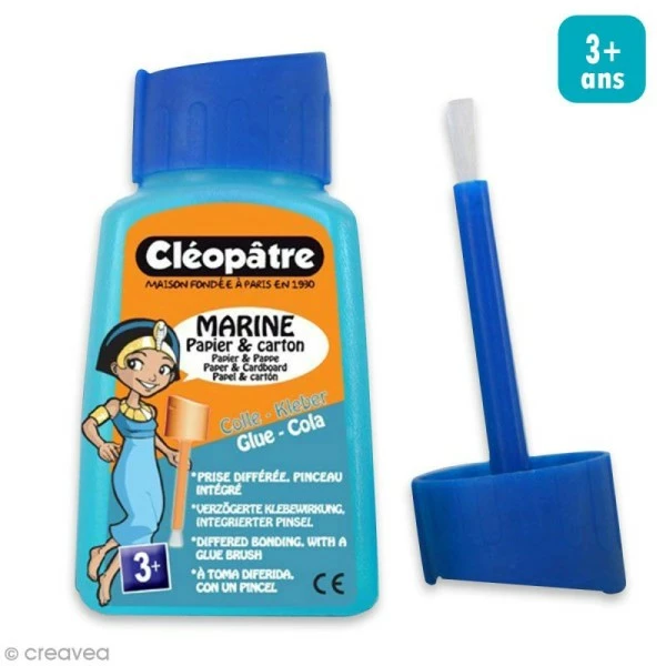 La colle bleue Cléopâtre est une colle d’excellente qualité qui devient transparente après séchage. La couleur bleutée et le bouchon avec pinceau applicateur permet aux créateurs en herbe de voir exactement où ils ont appliqués la colle. Ils gagnent ainsi en précision.