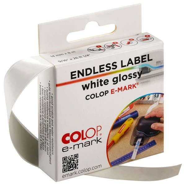 Grâce à ce rouleau adhésif de 14 mm x 8 mètres, vous pourrez réaliser des étiquettes de la longueur que vous souhaitez ! Il a été spécialement conçu pour une utilisation avec la mini imprimante multi-fonctions E-mark Create de COLOP.