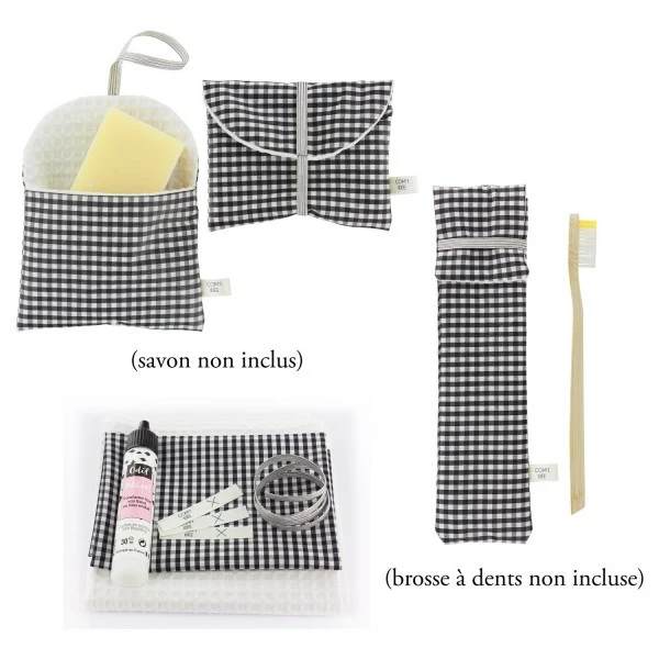 Découvrez ce kit créatif pour confectionner un kit de toilette nomade en tissu vichy Noir pour vous accompagner durant vos vacances ou vos déplacements !