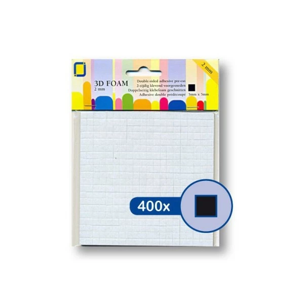 400 Carrés mousse adhésifs double face. Taille5 x 5 mm Epaisseur2 mm ColorisNoirs