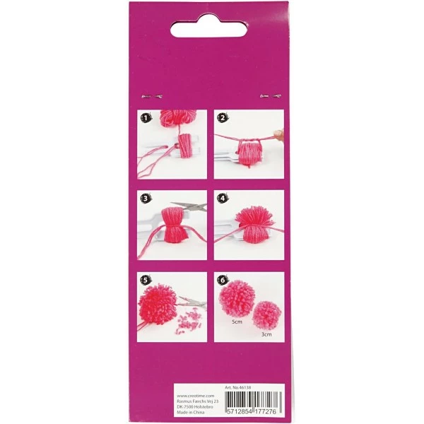 Outil en plastique pratique pour la confection de pompons de 2 tailles différentes (diamètre d’anv. 3 et 5 cm).