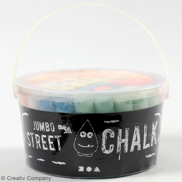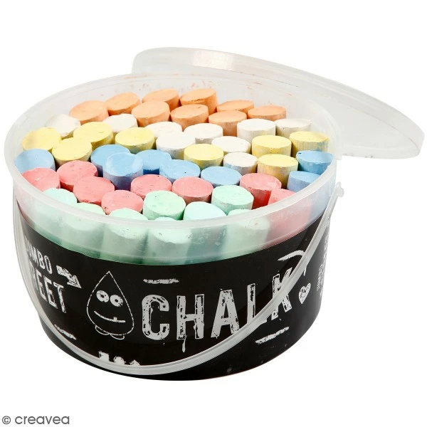 Seau comprenant 50 craies de trottoir Creotime aux couleurs assorties (blanc, rouge, jaune, bleu, vert, etc.).