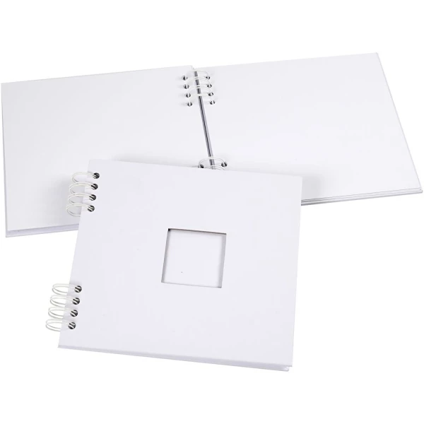 Scrapbook/album photo rigide reliure spirale – couverture avec fenêtre carrée. Vous pourrez le scrapper comme bon vous semble, intérieur comme extérieur et il pourra recueillir vos notes, croquis et pensées. Vous pourrez embellir la couverture de votre carnet 20 x 20 cm blanc ainsi que son intérieur avec du papier scrapbooking, du masking tape, des formes en feutrine ou bien dessiner dessus au marqueur Posca. Tout est possible !