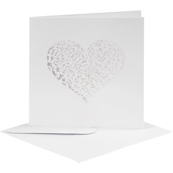 Double carte exclusive en papier cartonné épais (240 gr) décorée d’une coeur finement découpé. Enveloppe (110 gr) incluse. Les cartes comme les enveloppes ont une belle surface nacrée.