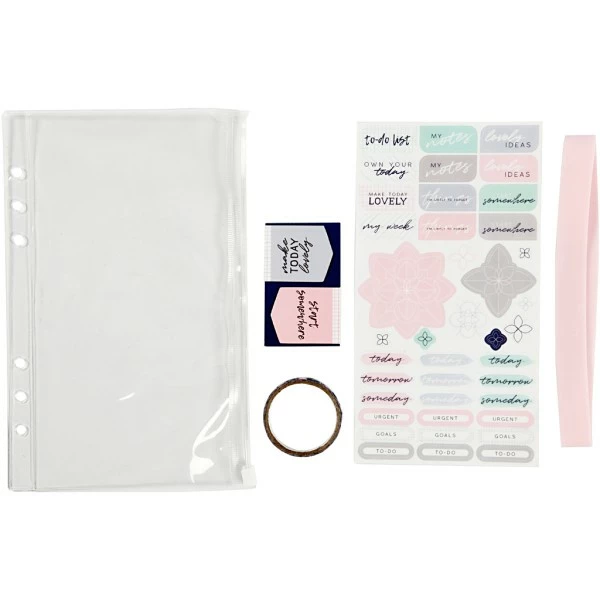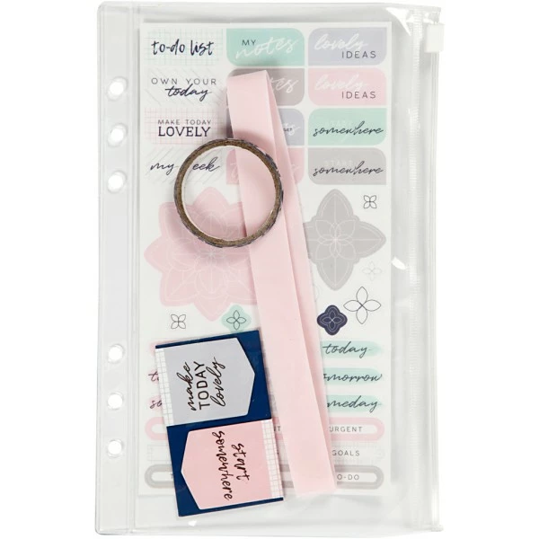 Pochette plastique pratique à fermeture coulissante et à 6 trous, afin qu’elle puisse être utilisée avec les Planner agenda Creotime pour en faire un journal de voyage ou créatif. InclusAutocollants, ruban adhésif de masquage et deux.