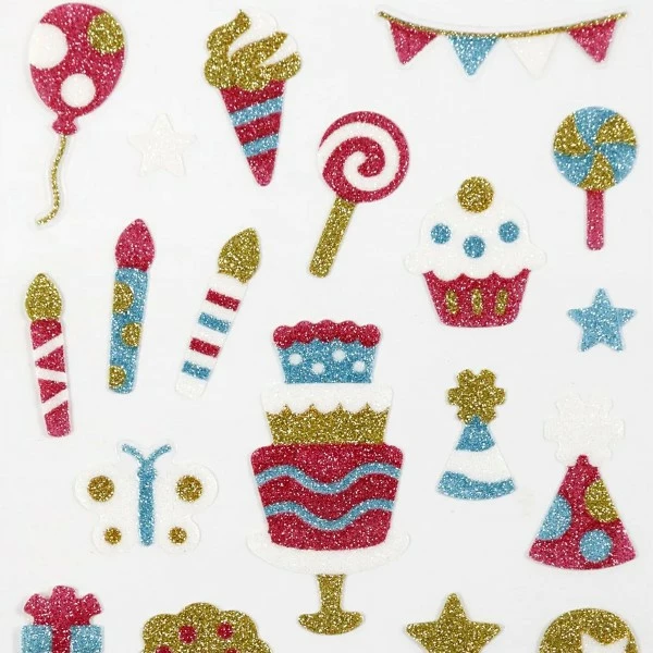 Description de Stickers pailletés – Anniversaire – 1 à 3,5 cm – 27 pcs