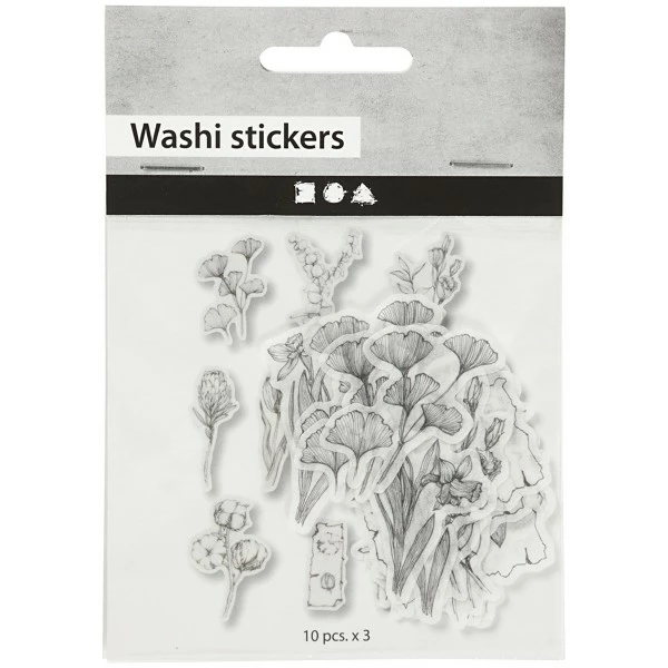 Ce lot contient 30 stickers (10 designs différents) motifs Fleurs Noir et Blanc de 3 à 5 cm environ en papier washi. Ce papier adhésif décoratif, repositionnable à l’infini, peut être utilisé en scrapbooking et carterie comme en Home Deco. D’origine japonaise, le papier washi est un papier traditionnel artisanal fabriqué à base de fibres de mûrier.