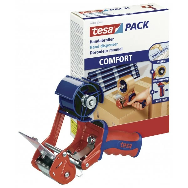 Le dérouleur pour ruban adhésif d’emballage Tesa est robuste. Avec son cadre en métal, il est peut être utilisé dans un cadre professionnel (palettisation, préparation de colis et cartons). Sa poignée est ergonomique avec une prise antidérapante confortable. Il est possible de régler la tension de l’adhésif.