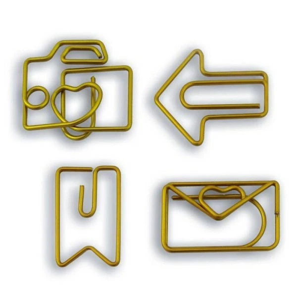 Kit de 8 trombones fantaisie dorées (4 modèles en 2 exemplaires chacun). Mettez de l’ordre dans vos documents avec solidité et fantaisie, avec ces trombones dorés. Ces trombones métalliques originaux représentent 2 enveloppes avec cœur, 2 flèches, 2 appareils photo et 2 fanions. Dimensions1,5 x 3 cm