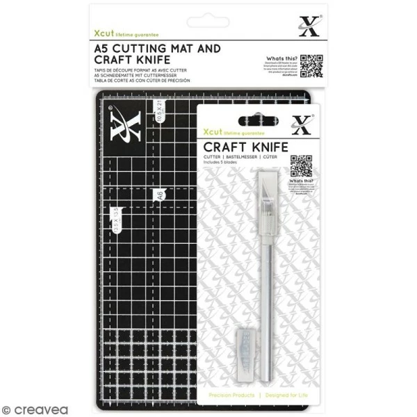 Ce kit de découpe Xcut contient 1 cutter de 14 cm et 1 tapis de coupe noir au format A5 (14,8 x 21 cm). De quoi réaliser, facilement et en toute sécurité, des découpages précis. Avec le cutter, 5 lames de rechange sont également fournies. Sur le tapis de découpe, des repères sont indiqués pour faciliter la découpe.