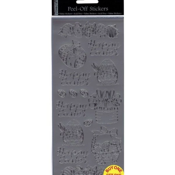 Planche de stickers peel off argent Pâques Enlever l’autocollant de la planche en faisant attention. Pour plus de contrôle et de facilité, le soulever avec une pince à épiler.Placer le sticker peel off sur votre projet. Une fois content de la position du stickers, presser fermement.Vous pouvez laisser le stickers ainsi. Alternativement, vous pouvez le coloriez en utilisant des crayons de couleurs, pastels ou peinture.Les stickers peel off sont idéals pour la création de cartes, de pages de scrapbooking, verrerie, bois, bougies, plastique, métal et beaucoup plus. Thèmestickers peel off oeufs de Pâques, stickers peel off Pâques