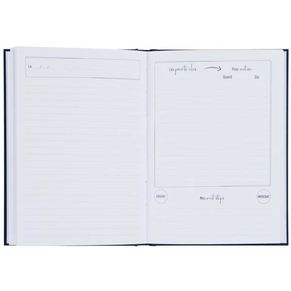 Grâce à ce carnet de réunion Draeger by Toga, assumez votre work-attitude. Vous pourrez y noter vos objectifs et futures actions dans une ambiance studieuse. Ce carnet de note est composé de 192 pages soit 96 réunions environ. La page de droite est consacrée aux éléments clés de la réunion, aux actions à mettre en place et aux prochaines étapes et la page de gauche est consacrée à la prise de note durant la réunion.