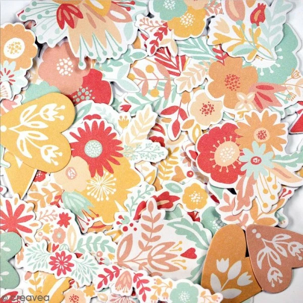 Assortiment de 70 dies cuts Nature vert, orange et rose (formes en papier découpées), très pratiques pour décorer et embellir des pages de scrapbooking, des cartes, des faire-part, etc. Ils pourront même prendre place sur vos étiquettes de paquets cadeaux. Chaque forme mesure De 3 à 8 cm.