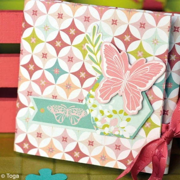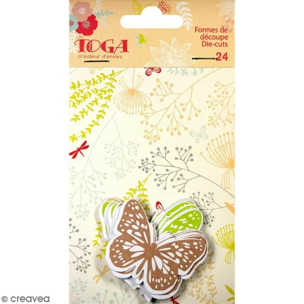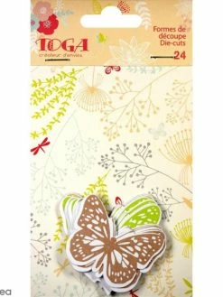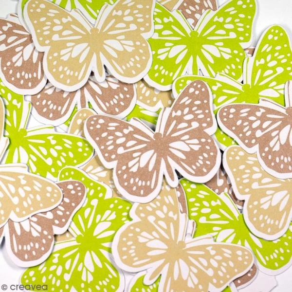 Assortiment de 24 dies cuts Papillons taupes, verts et beiges (formes en papier découpées), très pratiques pour décorer et embellir des pages de scrapbooking, des cartes, des faire-part, etc. Ils pourront même prendre place sur vos étiquettes de paquets cadeaux. Chaque forme mesure 48 x 36 mm.