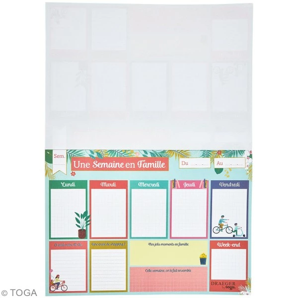 - 10 parties à remplir5 jours de la semaine, 1 partie week-end, 1 to do list, 1 partie shopping, 1 partie « Nos jolis moments en famille » et 1 partie « Cette semaine, on le fait ensemble »