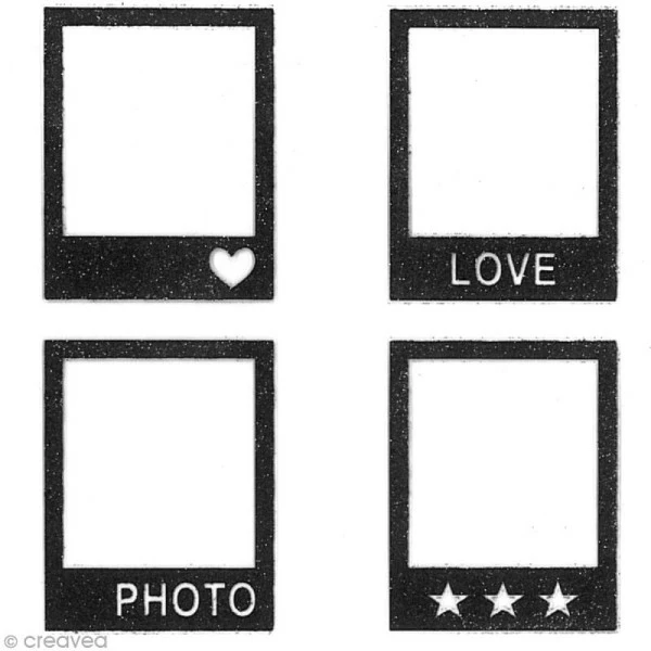 Lot de 4 stickers Polaroïd couleur Noir de la collection Oh ! Glitter de Toga. Ces 4 stickers fantaisies pailletés pourront être collés partout pour apporter une touche de fantaisie sur les supports de votre choixcartes, pages de scrapbooking, carnet, objets en bois, étiquettes cadeaux, etc. Ces 4 stickers Polaroïd rectangulaires (4,2 x 3,4 cm) seront parfaits pour décorer et embellir des petites photos telles que des photos d’identités. Vous trouverez un motif ou un mot dans la partie inférieurs de chacun de ces stickers pailletés de couleur Noirmotif coeur, motif 3 étoiles, texte « LOVE », texte « PHOTO ». Apportez de la fantaisie et de l’originalité à vos créations et/ou à votre décoration grâce à ces 4 stickers Polaroïd pailletés de couleur Noir.