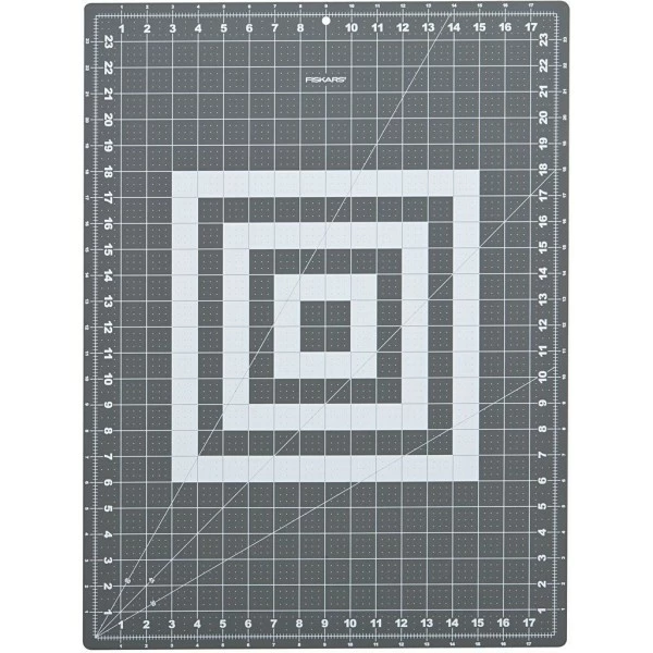Solide tapis de coupe Fiskars, auto cicatrisant, double face, avec angles et quadrillage en cm et pouces.