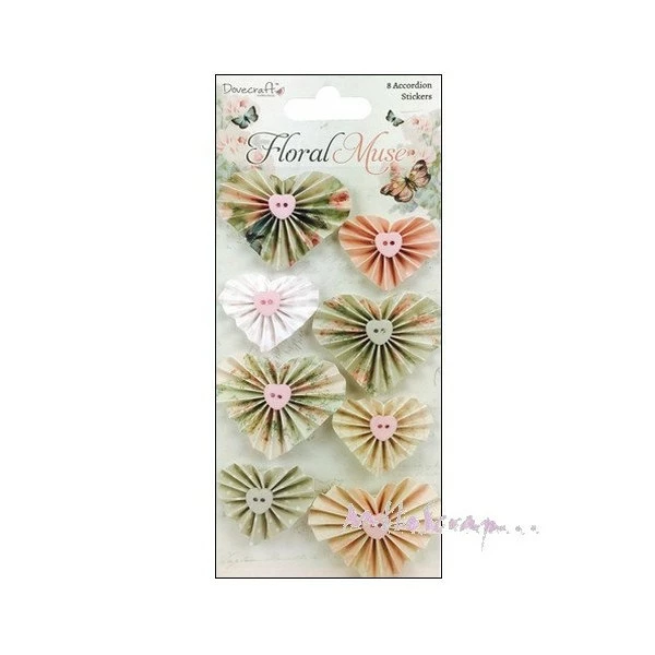 Lot de 8 coeurs cocardes autocollantes de la marque Dovecraft, collection “Floral Muse”.