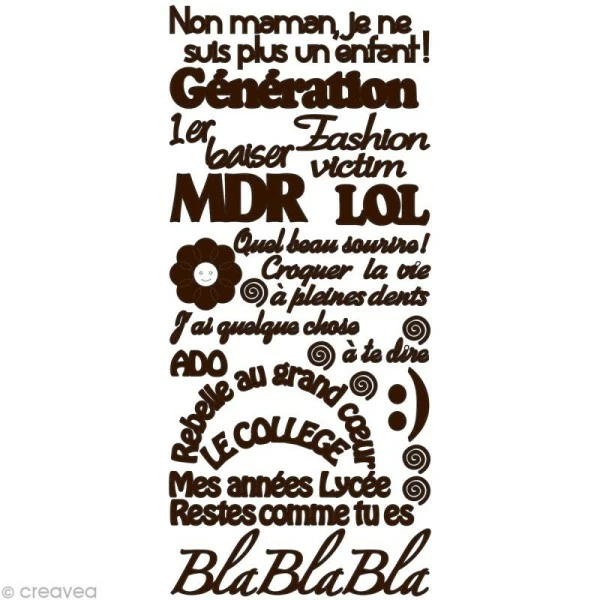 Cette planche de Peel Off vous propose un assortiment de stickers (autocollants) sur le thème de l’ Adolescent. Les stickers Peel Off (issus de la collection Mes P’tits Mots by Geca), vous sont proposés dans une couleur Marron, sur une planche de 10 x 23 cm. Très utilisés en carterie et en scrapbooking, les Peel Off ont l’avantage de posséder une incroyable finesse en matière de détails.