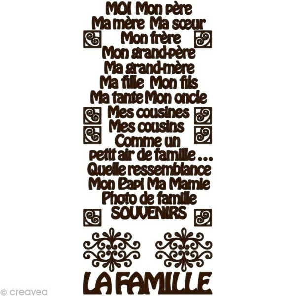 Cette planche de Peel Off vous propose un assortiment de stickers (autocollants) sur le thème de la Famille. Les stickers Peel Off (issus de la collection Mes P’tits Mots by Geca), vous sont proposés dans une couleur Marron, sur une planche de 10 x 23 cm. Très utilisés en carterie et en scrapbooking, les Peel Off ont l’avantage de posséder une incroyable finesse en matière de détails.