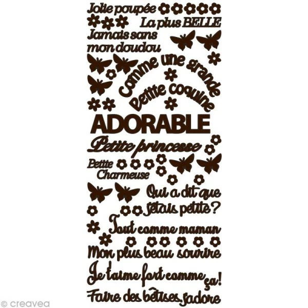 Cette planche de Peel Off vous propose un assortiment de stickers (autocollants) sur le thème d’une Petite Fille. Les stickers Peel Off (issus de la collection Mes P’tits Mots by Geca), vous sont proposés dans une couleur Marron, sur une planche de 10 x 23 cm. Très utilisés en carterie et en scrapbooking, les Peel Off ont l’avantage de posséder une incroyable finesse en matière de détails.