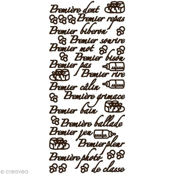 Cette planche de Peel Off vous propose un assortiment de stickers (autocollants) sur le thème des Premières Fois De Bébé. Les stickers Peel Off (issus de la collection Mes P’tits Mots by Geca), vous sont proposés dans une couleur Marron, sur une planche de 10 x 23 cm. Très utilisés en carterie et en scrapbooking, les Peel Off ont l’avantage de posséder une incroyable finesse en matière de détails.