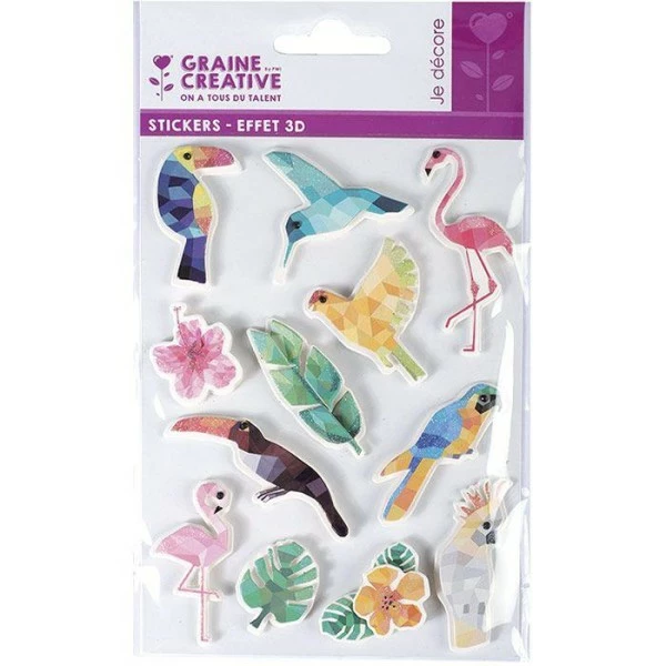 Planche de 12 stickers en 3D sur le thème des oiseaux tropicaux à coller sur tous vos projets de scrapbooking, vos cartes de vœux, vos faire-part et toutes vos idées de DIY. A l’intérieur de ce pack, vous pourrez trouverdes toucans, un colibri, des flamants roses, des oiseaux tropicaux, des feuilles tropicales et des fleurs exotiques. Chaque sticker se colle grâce à un petit élèment collant présent au dos de chaque sticker.