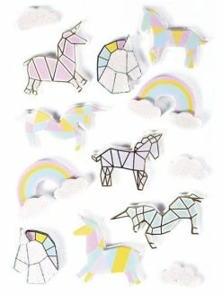 Planche de 13 stickers en 3D sur le thème des licornes à coller sur tous vos projets de scrapbooking, vos cartes de vœux, vos faire-part et toutes vos idées de DIY. A l’intérieur de ce pack, vous pourrez trouver 3 licornes multicolores, 3 licornes origami, 2 têtes de licorne géométriques, 3 arc-en-ciel et 3 petits nuages. Chaque sticker se colle grâce à un petit élèment collant présent au dos de chaque sticker. Un sticker licorne mesure 50 mm.