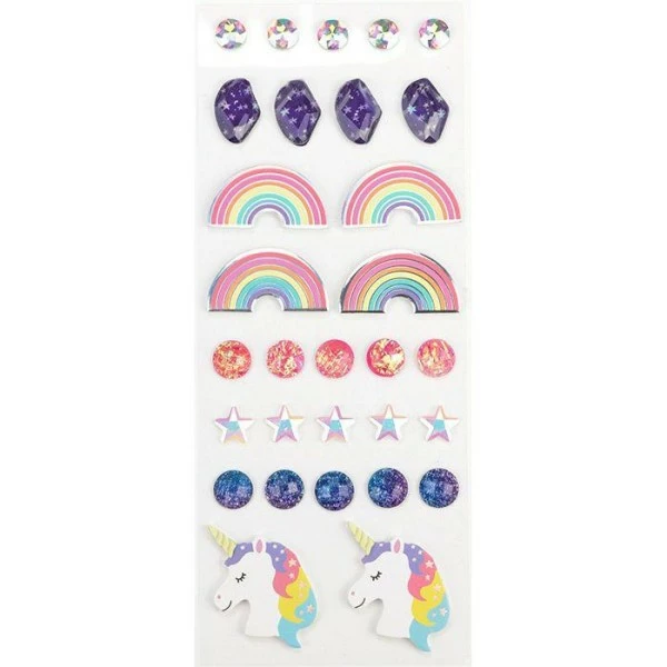 30 stickers 3D – Arc-en-Ciel Planche de 30 stickers en 3D arc-en-ciel et licorne. A coller sur tous vos projets de scrapbooking, vos cartes de vœux de fin d’année, vos faire-part et toutes vos idées de DIY. En papier cartonné et en relief, ces stickers originaux mettent bien en valeurs leurs motifs. Ici, vous trouverez des autocollants licorne, arc-en-ciel, et autres stickers de formes diverses à paillettes. Couleursmauve et rose clair. Dimensions par sticker4 cm environ.
