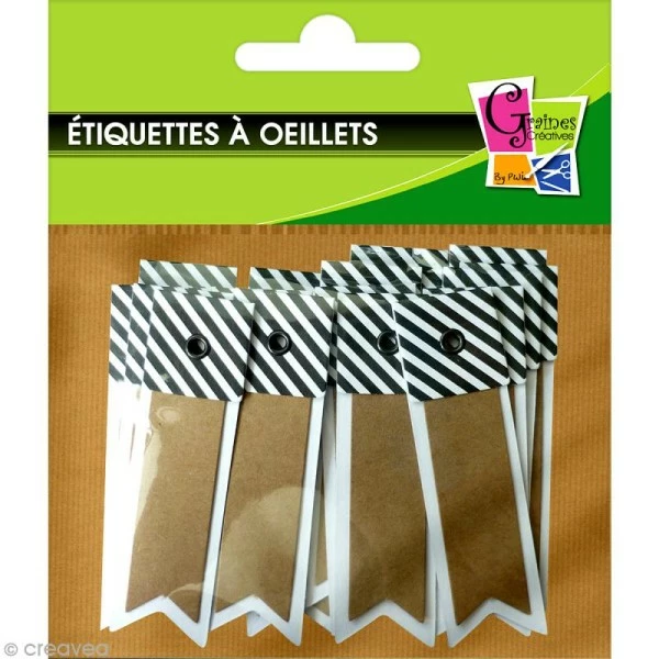 Lot de 20 étiquettes à Rayures en papier kraft et papier blanc en forme de fanion. Elles font 2 x 7 cm et sont munies d’un oeillet noir de 2,5 mm de diamètre. Elles seront parfaites pour décorer vos paquets cadeaux.