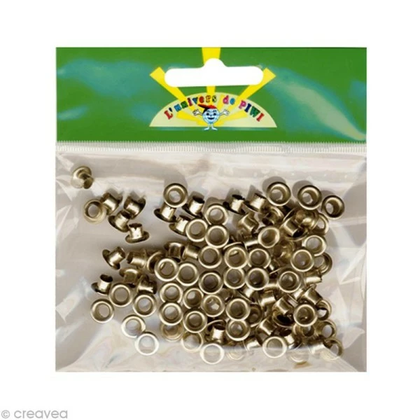 Lot de 100 oeillets argentés, idéal pour embellir vos faire-parts, vos créations de scrapbooking, carterie et encadrement. Nécessite un outil de pose d’oeillet ainsi qu’un tapis de pose.