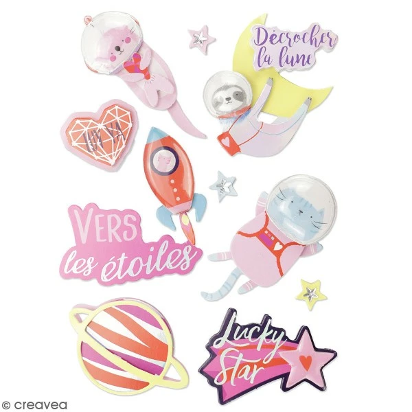 Planche contenant 10 autocollants 3D sur le thème Galaxie avec des jolies formes de chats et loutres de l’espace.