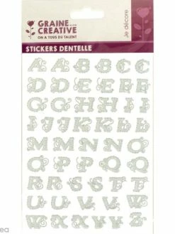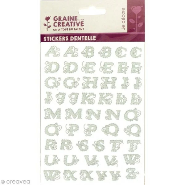 Ces 52 stickers dentelle Alphabet majuscule Graine Créative agrémenteront toutes vos créations. Ces petits stickers imitation dentelle seront parfaits pour décorer vos bocaux, cahiers et pages de scrapbooking.